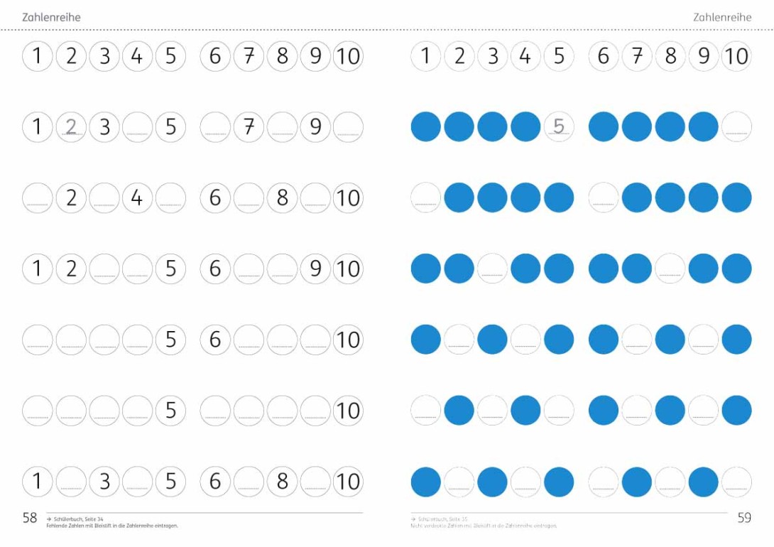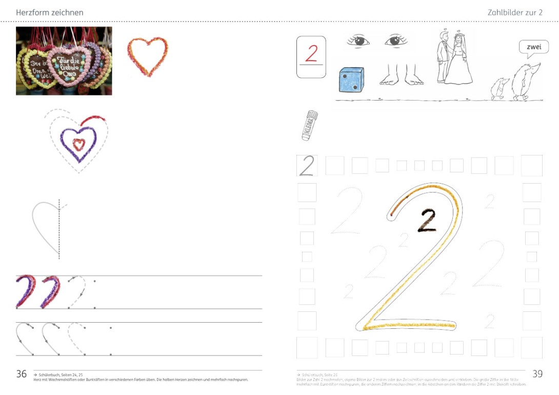 Im Arbeitsheft 0 wird der Erfassung kleiner Anzahlen und der Schulung der Feinmotorik jeweils großer Raum gegeben. Das Zeichnen von Formen geht nahtlos in das Zeichnen von Ziffern über.