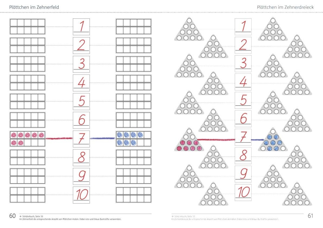 Zu Zahlen müssen im Zehnerfeld sowie im Zehnerdreieck passende Plättchenbilder gemalt werden.