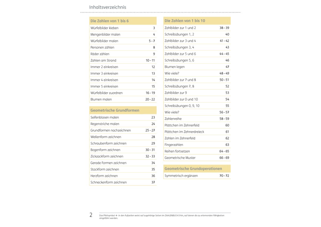 Im Inhaltsverzeichnis werden die Schwerpunkt des Arbeitshefts deutlich. Auch bei der Bearbeitung der arithmetischen Themen wird die Feinmotorik geschult.