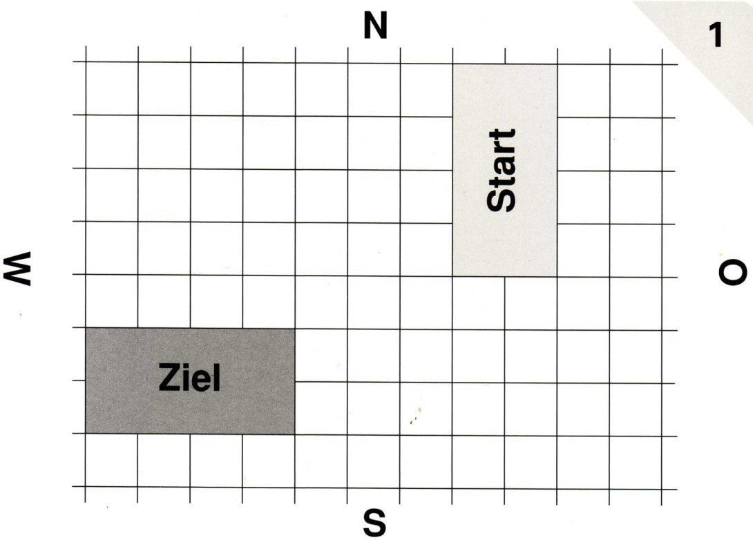 Im ersten Spiel (für 4 Personen) geht es bei jeder der 40 Aufgaben darum, drei Quader (Gebäude) in unterschiedlicher Lage vier vorgegebenen Seitenansichten entsprechend auf einem Grundplan (mit Karogitter) aufzustellen. Vier Kinder sitzen um den Plan herum, auf dem die vier Himmelsrichtungen N, O, S, und W angegeben sind. Jedes Kind ist für die Himmelsrichtung auf seiner Seite zuständig. Es gibt drei verschiedenen Aufgabentypen, bei denen in unterschiedlicher Weise Karten mit Seitenansichten mit einer Grundrisskarte zu koordinieren sind.Der Reiz des Spieles besteht darin, dass keines der vier Kinder von seiner Seite aus die volle Information hat, um eine Aufgabe zu lösen. Die Kinder kommen nur zum Ziel, wenn sie kooperieren!