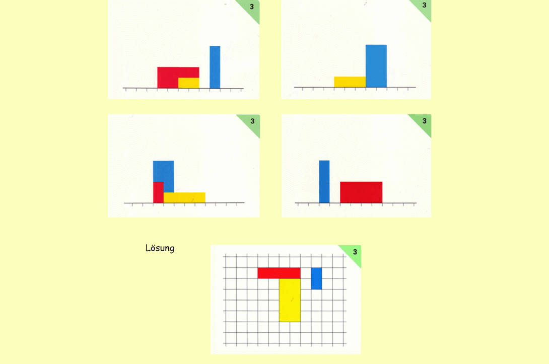 Bei dem zweiten Typ von Aufgaben wird nur ein einziger Quader verwendet. Er wird in beliebiger Lage (hochkant, seitlich, flach) auf eine Startposition gelegt, sodass er von Gitterlinien begrenzt wird und ganze Gitterquadrate überdeckt. Dann darf er um eine Grundkante beliebig in eine andere Lage gekippt werden und wird dann wieder von Gitterlinien begrenzt. Die Kippbewegungen müssen so gewählt werden, dass eine vorgegebene Zielposition erreicht wird. Dabei wird vorausschauendes Denken gefordert und gefördert!
