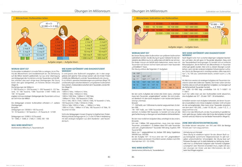 Der Blitzrechenkurs besteht aus je 10 Übungen für den Zwanziger-, Hunderter-, Tausender- und Millionraum, die innerhalb jedes Raums und quer über die Räume systematisch aufeinander aufbauen. Wegen dieses Aufbaus ist der Blitzrechenkurs ein natürlicher Leitfaden für Fördern und Diagnose: Jede Übung verweist auf Übungen, die ihr vorangehen, und Übungen, die ihr nachfolgen.