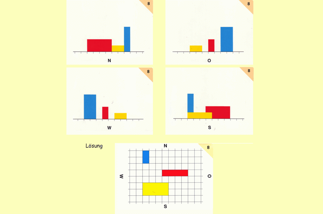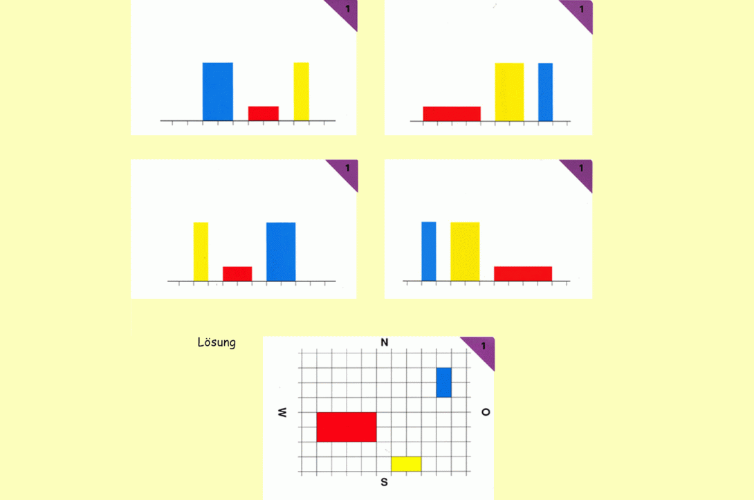 Im ersten Spiel (für 4 Personen) geht es bei jeder der 40 Aufgaben darum, drei Quader (Gebäude) in unterschiedlicher Lage vier vorgegebenen Seitenansichten entsprechend auf einem Grundplan (mit Karogitter) aufzustellen. Vier Kinder sitzen um den Plan herum, auf dem die vier Himmelsrichtungen N, O, S, und W angegeben sind. Jedes Kind ist für die Himmelsrichtung auf seiner Seite zuständig. Es gibt drei verschiedenen Aufgabentypen, bei denen in unterschiedlicher Weise Karten mit Seitenansichten mit einer Grundrisskarte zu koordinieren sind.Der Reiz des Spieles besteht darin, dass keines der vier Kinder von seiner Seite aus die volle Information hat, um eine Aufgabe zu lösen. Die Kinder kommen nur zum Ziel, wenn sie kooperieren!