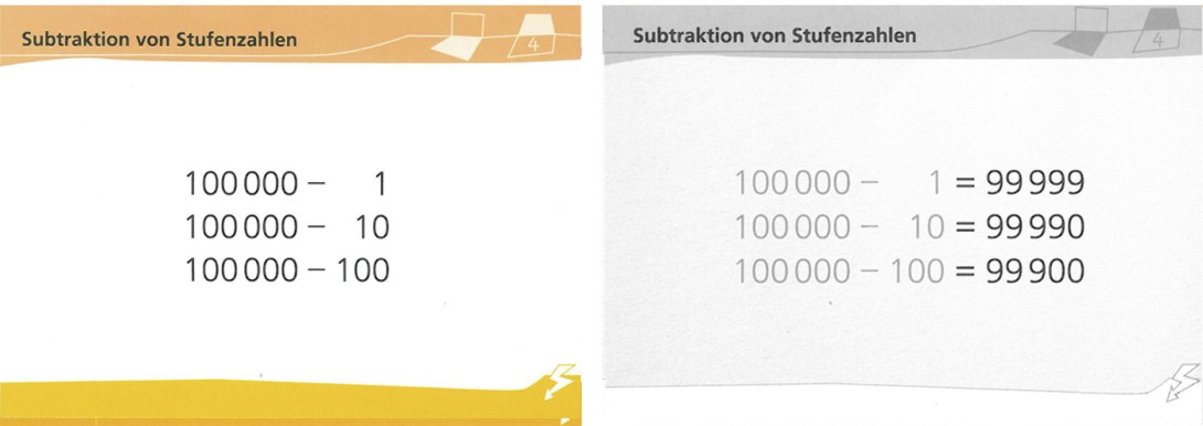 Zur praktischen Umsetzung des Kurses gibt es die Rechenkartei "Blitzrechnen. Basiskurs Zahlen", die entsprechend den Zahlenräumen vier Teile hat. Nicht nur Kinder können nach kurzer Anleitung durch die Lehrperson in kleinen Gruppen, in Partnerarbeit oder auch alleine selbstständig und eigenverantwortlich mündlich üben. Auch Eltern oder andere Betreuer von Kindern können mit den Kindern mithilfe der Rechenkartei unter Anleitung und im Kontakt mit der Schule zusätzlich gezielt üben. Dem Unterricht wird auf diese Weise zugearbeitet und nicht, wie es bei häuslicher Nachhilfe häufig der Fall ist, entgegen gearbeitet. Der Grundsatz, dass vorschnelles Automatisieren möglichst zu vermeiden ist, muss dabei den Erwachsenen ganz besonders ans Herz gelegt werden.